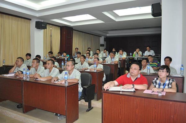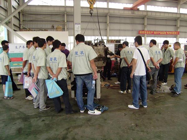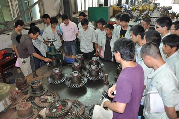 本次研討學習班共有來自全國各地區(qū)共計40名的一線服務人員參加。此次學習班,引起我司領導高度重視,不僅組織了相關部門領導系統(tǒng)授課:從新品介紹到各個機型的特點,從發(fā)動機故障判斷維修到管路液壓件原理介紹,從制動系統(tǒng)學習到油缸的拆裝;而且與相關配套廠商協(xié)商,組織全體學員到相應的工廠系統(tǒng)學習驅動橋、變速箱、變矩器等主要零配件安裝維護課程!